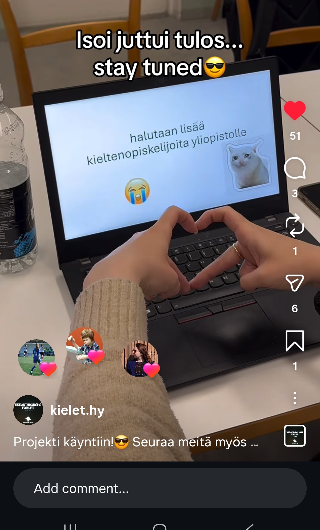 Hauskin opetukseen – ja myös yhteiskunnalliseen vuorovaikutukseen – liittyvä hanke on ehdottomasti sometiimi! Löimme hynttyyt yhteen saksan (professori Leena Kolemainen) ja venäjän (yliopisto-opettaja Arja Kirvesmäki) kanssa ja rekrytoimme kuusi opiskelijaa tekemään somemarkkinointia opiskelijoiden äänellä: videoita kieltenopiskelijoiden arjesta, hauskoja opiskelijatapahtumia ja myyttien murtamista kieltenopiskelusta. Opiskelijat saavat opintopisteet esimerkiksi työharjoitteluun tai soveltavan projektityön kurssiin.